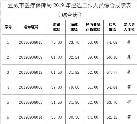 按照《宣威市醫(yī)療保障局2019年公開遴選公務(wù)員公告》要求,宣威市醫(yī)療保障局2019年公開遴選公務(wù)員筆試、面試和經(jīng)歷業(yè)績(jī)?cè)u(píng)價(jià)工作已結(jié)束,現(xiàn)將綜合成績(jī)進(jìn)行公告。