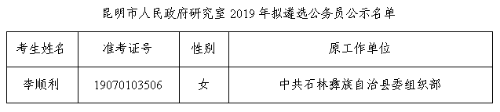 昆明市人民政府研究室 2019年擬遴選公務(wù)員人選公示