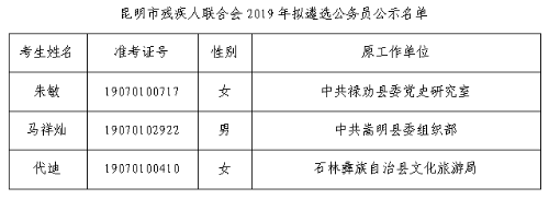 昆明市殘疾人聯(lián)合會(huì) 2019年擬遴選公務(wù)員人選公示