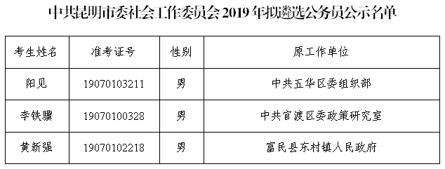 中共昆明市委社會(huì)工作委員會(huì)2019年擬遴選公務(wù)員人選公示