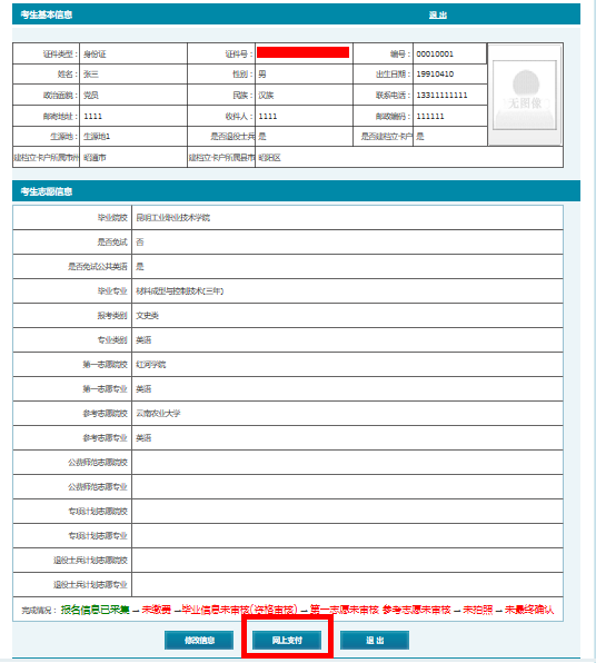 3、點(diǎn)擊信息展示頁(yè)面中【網(wǎng)上支付】按鈕,交報(bào)名費(fèi)。