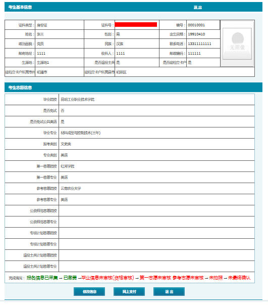 7、點(diǎn)擊【返回】按鈕,返回報(bào)名信息展示頁(yè)面,如需更改信息,點(diǎn)擊【修改信息】按鈕,如無(wú)誤后及時(shí)退出系統(tǒng)。