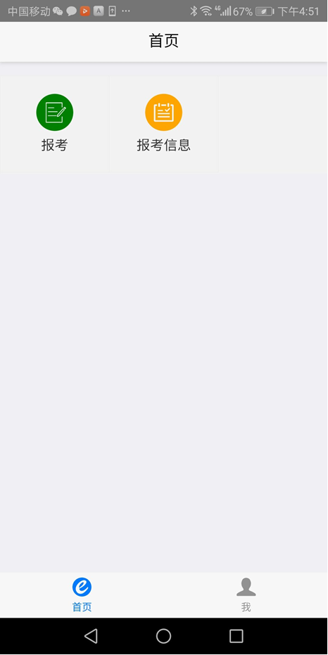 (二)進(jìn)入平臺后,界面下方顯示“首頁”和“我”兩個(gè)選項(xiàng),“首頁”選項(xiàng)顯示“報(bào)考”和“報(bào)考信息”兩個(gè)按鈕,“我”選項(xiàng)顯示考生基本信息和“注銷”功能。如下圖所示: