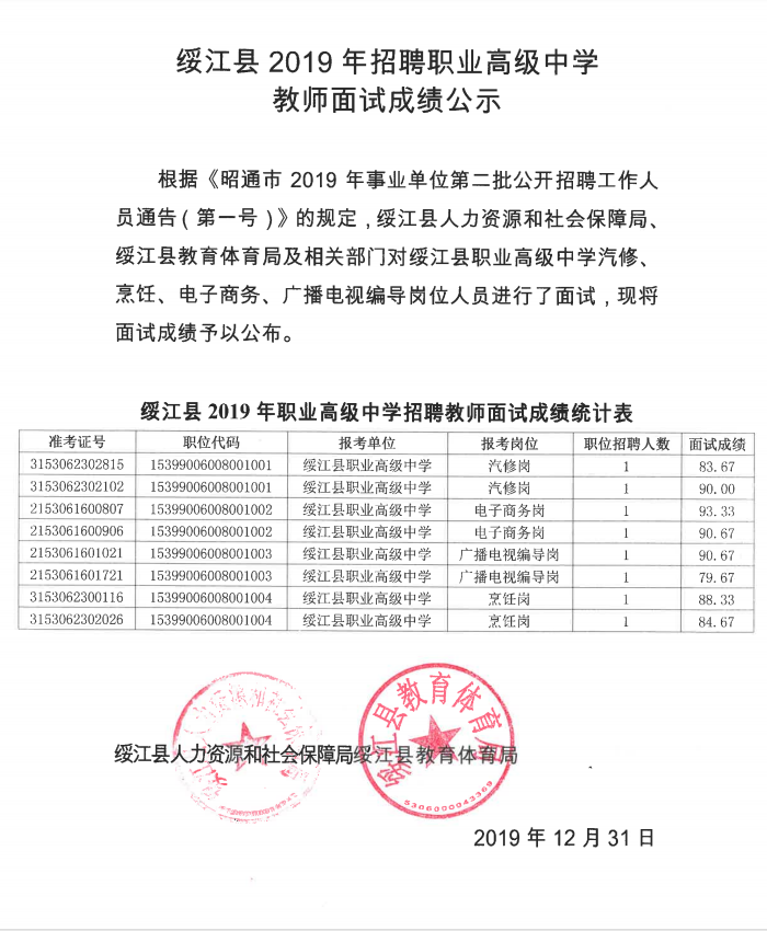綏江縣2019年招聘職業(yè)高級中學(xué)教師面試成績公示