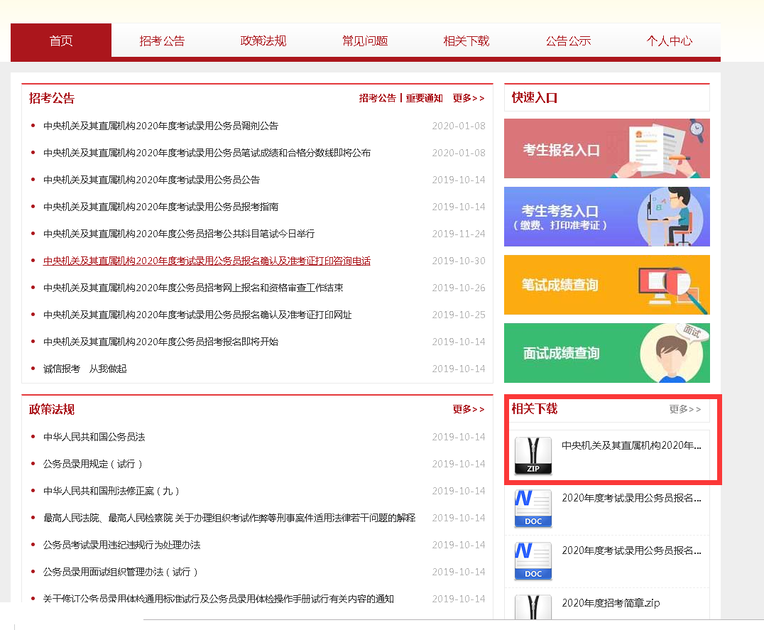 點擊官網(wǎng)下載之后,進入到“中央機關(guān)及其直屬機構(gòu)2020年度考試錄用公務(wù)員專題網(wǎng)站”,如下圖: