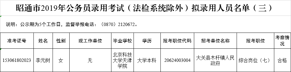 昭通市2019年公務(wù)員錄用考試(法檢系統(tǒng)除外)擬錄用人員名單(三)
