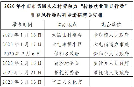 為進一步做好公共就業(yè)服務,助推我市建檔立卡貧困人員、城鎮(zhèn)失業(yè)人員、離校未就業(yè)高校畢業(yè)生等群體實現就業(yè)再就業(yè),搭建好企業(yè)、求職者之間雙向選擇平臺,解決企業(yè)用工需求,助力我市經濟發(fā)展。經研究,決定在我市5個鄉(xiāng)(鎮(zhèn)、街道)開展2020年個舊市第四次農村勞動力“轉移就業(yè)百日行動”暨春風行動系列專場招聘會。