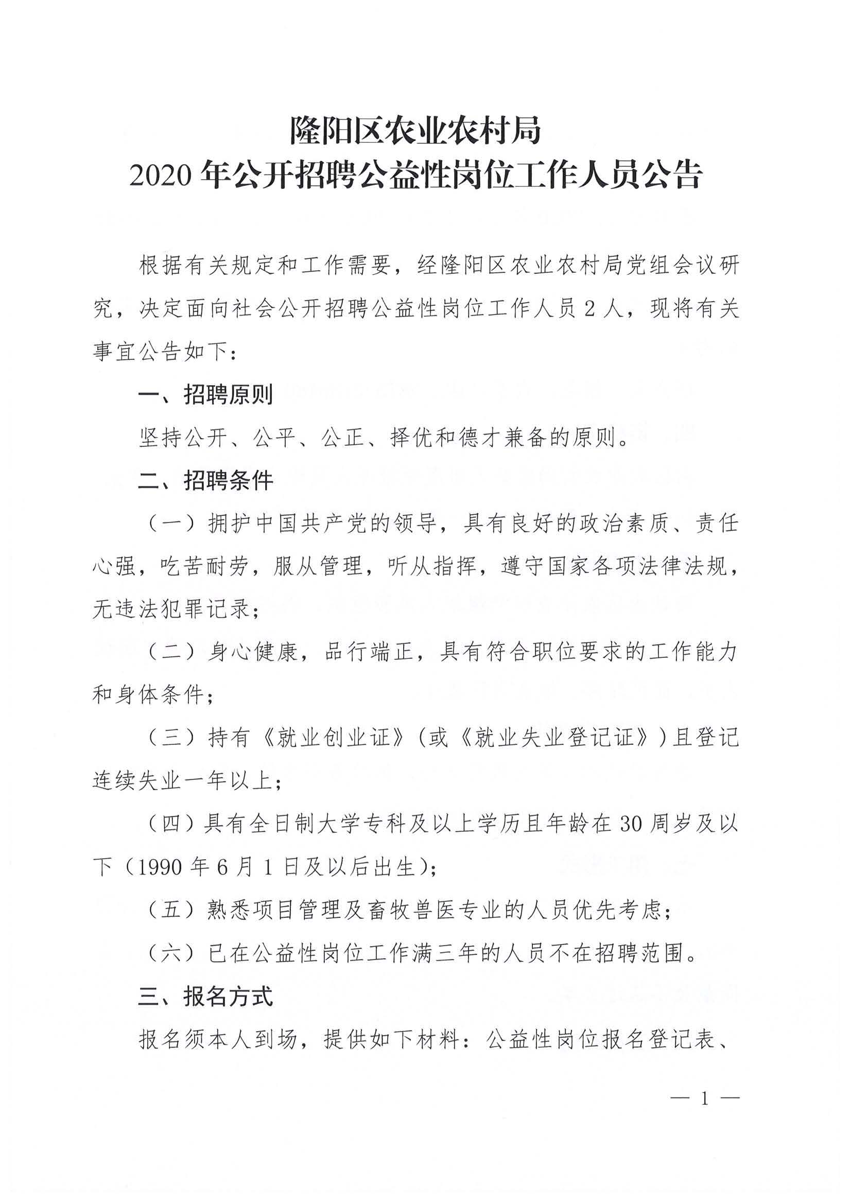 隆陽區(qū)農(nóng)業(yè)農(nóng)村局2020年公開招聘公益崗位工作人員公告
