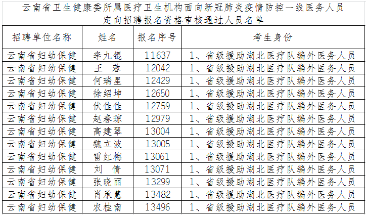 面向新冠肺炎疫情防控一線醫(yī)務(wù)人員定向招聘報(bào)名資格審核通過人員名單