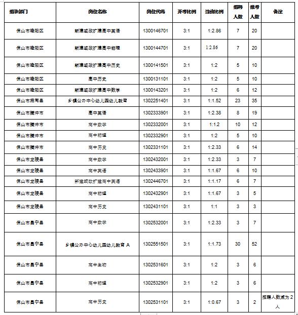 根據(jù)《保山市應對新冠肺炎疫情影響大幅增加名額面向全國開展基礎教育學校專項招聘優(yōu)秀高校畢業(yè)生公告》及有關規(guī)定,2020年保山市面向全國開展基礎教育學校專項招聘優(yōu)秀高校畢業(yè)生計劃招聘崗位106個,共計575人。網(wǎng)絡報名工作已于6月6日上午12:00結(jié)束。經(jīng)統(tǒng)計共有2659名考生通過資格審查、繳費、完成報名。在計劃招聘的106個崗位中有81個崗位(含11個不設開考比例的崗位,70個報名人數(shù)與招聘人數(shù)達到或超過3:1比例的崗位)可以正常開考;取消5個無人報考崗位招聘計劃14人;有20個崗位報名人數(shù)與招聘人數(shù)達不到3:1的比例,經(jīng)中共保山市委組織部、保山市人力資源和社會保障局、保山市教育體育局研究,并征求了保山市紀委市監(jiān)委派駐市人力資源和社會保障局紀檢監(jiān)察組意見,進行了崗位調(diào)劑,調(diào)劑后同意這20個崗位開考(含1個減少招聘計劃1人的崗位)。現(xiàn)將報名及崗位調(diào)劑情況向廣大考生進行公布(詳見附件)。