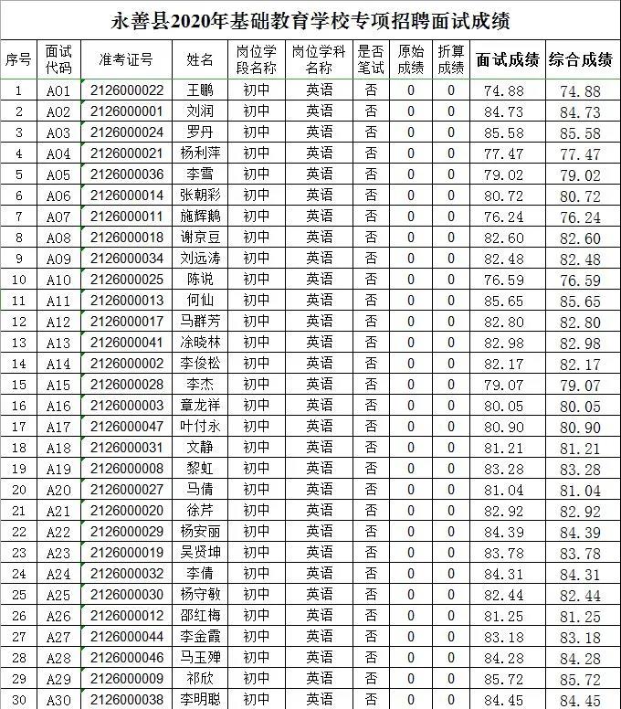 永善縣2020年基礎(chǔ)教育學(xué)校專(zhuān)項(xiàng)招聘面試成績(jī)