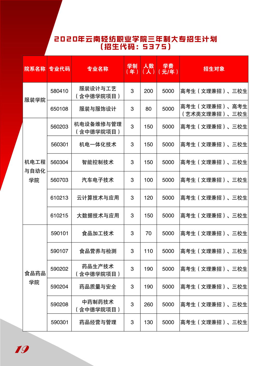 2020年云南輕紡職業(yè)學(xué)院三年制大專招生計(jì)劃