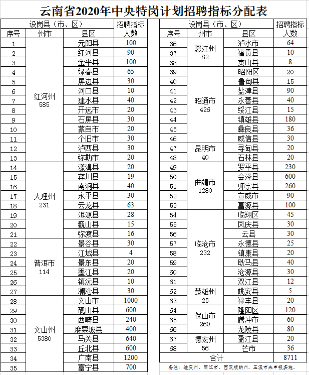 附件:云南省2020年中央特崗計(jì)劃招聘指標(biāo)分配表
