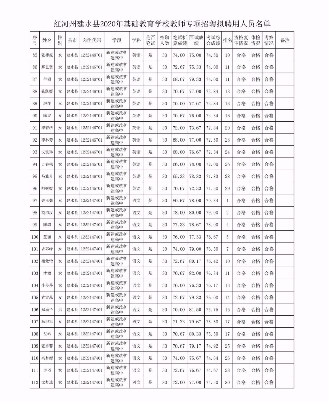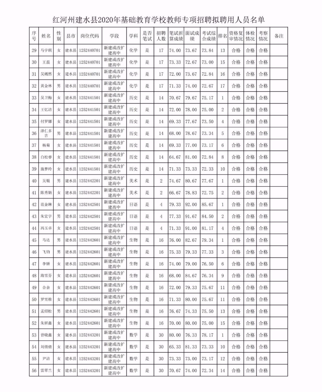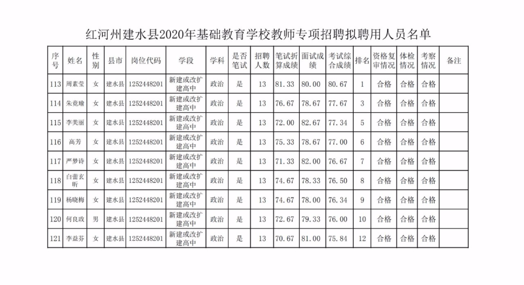 建水縣2020年專項招聘基礎教育學校教師擬聘用人員公示(第一批)