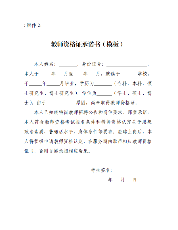 (4)2018年、2019年、2020年畢業(yè)的全日制普通高校本科及以上畢業(yè)生,暫未取得教師資格證,但符合教師資格考試報(bào)名條件和教師資格認(rèn)定關(guān)于思想政治素質(zhì)、普通話水平、身體條件等要求的,可按規(guī)定報(bào)考,報(bào)名時須在系統(tǒng)上傳承諾書(附件1)。