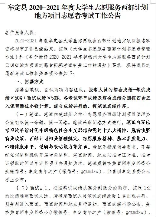 3.其他考試相關(guān)事宜詳見(jiàn)《牟定縣2020-2021年度大學(xué)生志愿服務(wù)西部計(jì)劃地方項(xiàng)目志愿者考試工作公告》。
