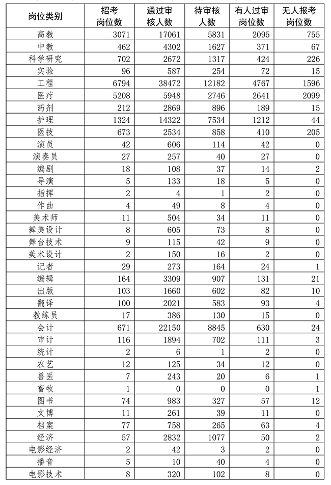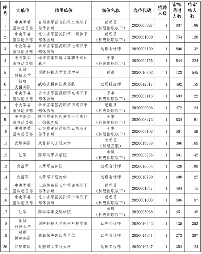 2020年全軍面向社會公開招考文職人員(不含博士崗位)網(wǎng)上報名還剩3天時間,截至2020年7月7日17時,有202258名報考人員通過網(wǎng)上報名資格初審,77352名報考人員正在審核。19308個崗位有考生報考、占78.7%,平均報招考比為11.4∶1,最高報招考比為945∶1,有5208個崗位暫時無人報考。網(wǎng)上報名系統(tǒng)將于7月10日18時準(zhǔn)時關(guān)閉,系統(tǒng)關(guān)閉后報考人員不能進行選報崗位、修改信息和提交證明材料等操作。請廣大報考人員理性選擇報考崗位,抓緊時間提交審核。相關(guān)崗位報考情況如下: