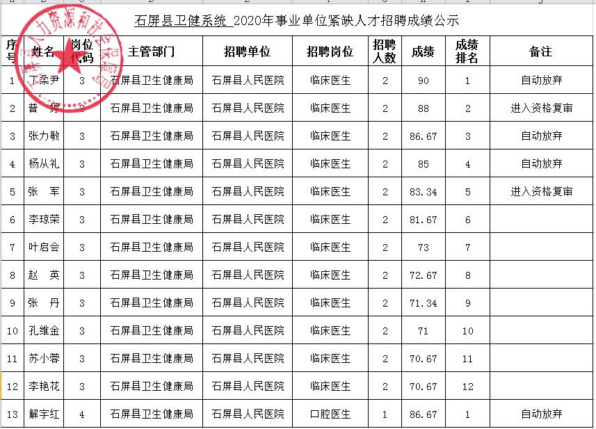 石屏縣衛(wèi)健系統(tǒng)2020年事業(yè)單位緊缺人才招聘成績(jī)公示
