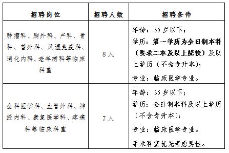 根據(jù)醫(yī)院業(yè)務發(fā)展需求,我院腫瘤科、胸外科、產(chǎn)科等臨床科室需招聘臨床醫(yī)師15名,具體招聘崗位及條件如下:
