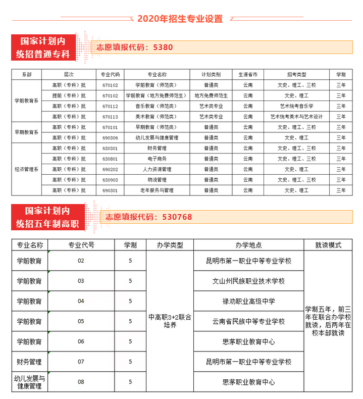 昆明幼兒師范高等專科學(xué)校2020年招生專業(yè)設(shè)置