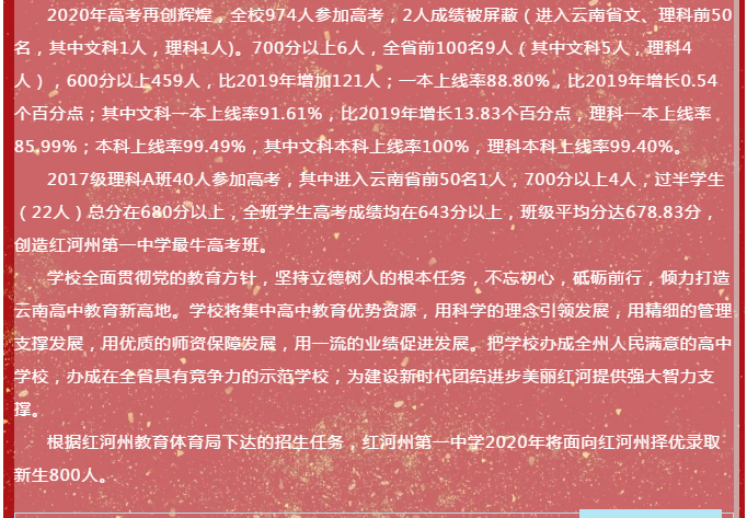 2020年紅河州初中畢業(yè)升學志愿實行統(tǒng)一網(wǎng)上填報志愿。由考生登陸《云南省招考頻道》(http://www.ynzs.cn),再進入《云南省招生考試工作網(wǎng)》注冊后登陸填報志愿。根據(jù)《紅河州教育體育局關于做好2020年高中階段學校招生志愿填報及錄取工作的通知》文件精神,紅河州第一中學為第一批次招生學校,按照劃定的招生范圍、招生計劃和考生志愿順序面向全州擇優(yōu)錄取800人。考生填報紅河州第一中學未被錄取不影響后面(第二、第三、第四批次所報學校)錄取。學校鄭重承諾:2020年中考實考分排列全州前800名的考生,