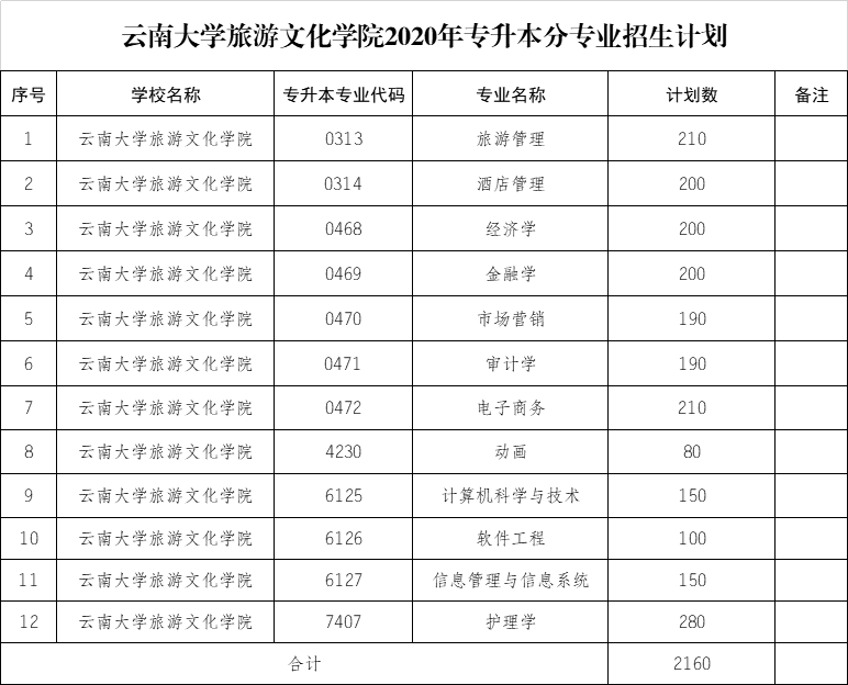 云南大學(xué)旅游文化學(xué)院2020年專升本招生計(jì)劃