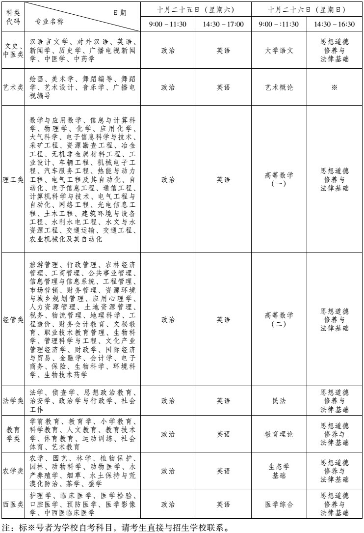 專科起點升本科統(tǒng)考科目按學科門類設置,考試科目均為兩門公共課、一門專業(yè)基礎課、一門加試科目。