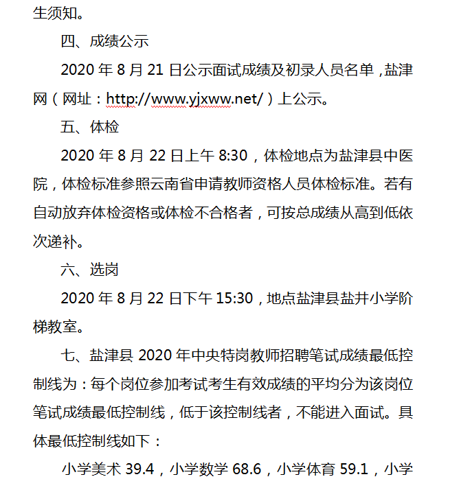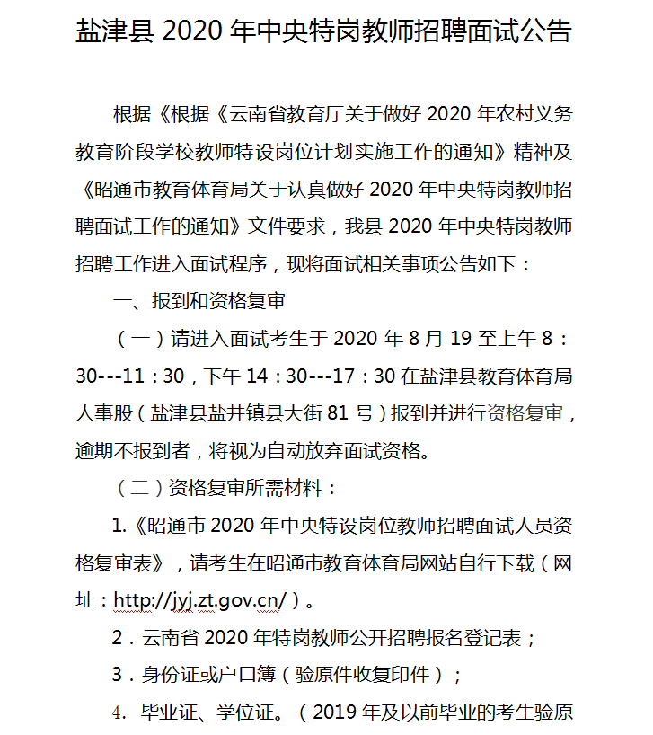 昭通市鹽津縣2020年中央特崗教師招聘面試公告