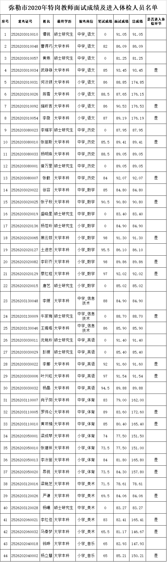 附件:彌勒市2020年招聘特崗教師面試成績及進入體檢人員名單