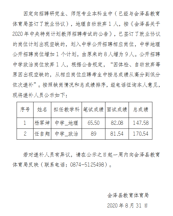 曲靖市會澤縣2020年特崗教師招聘遞補(bǔ)人員公示(一)