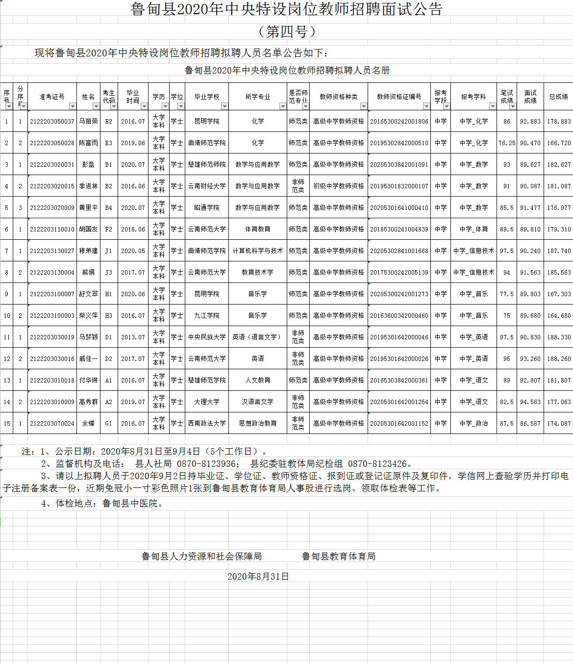 昭通市魯?shù)榭h2020年中央特設(shè)崗位教師招聘擬聘人員名單公告