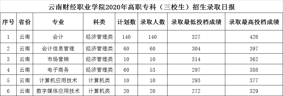 2020年云南財經(jīng)職業(yè)學院各專業(yè)錄取分