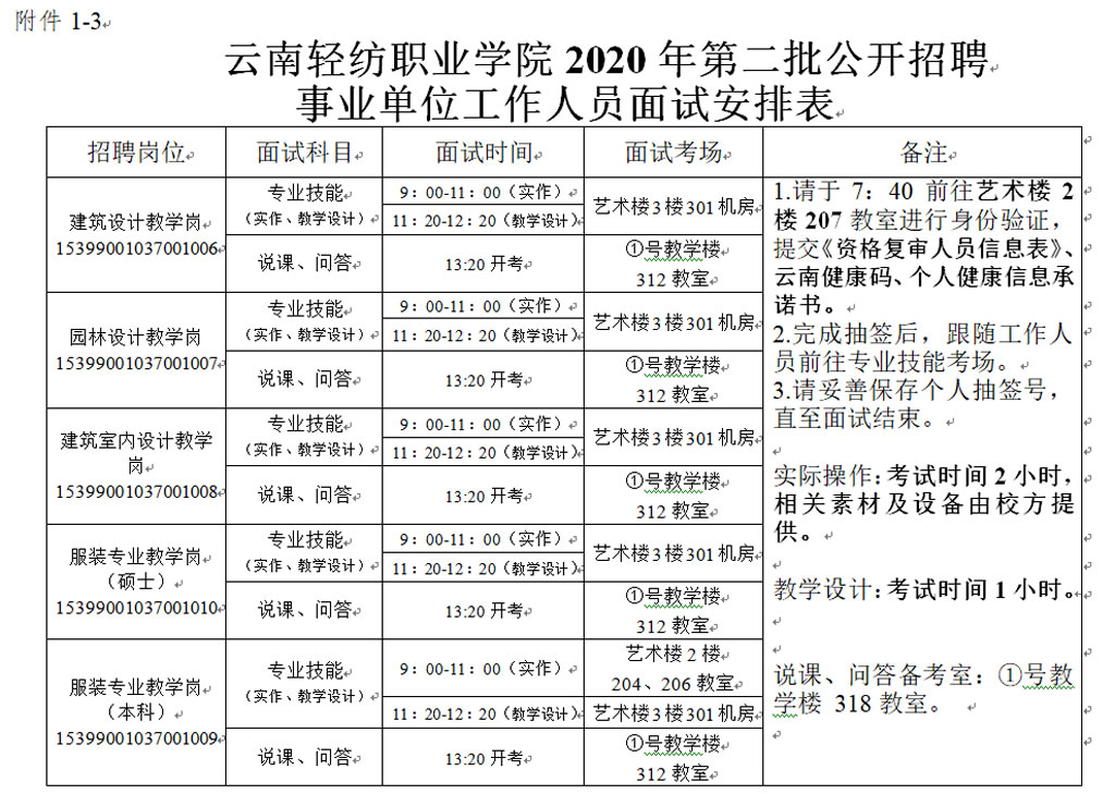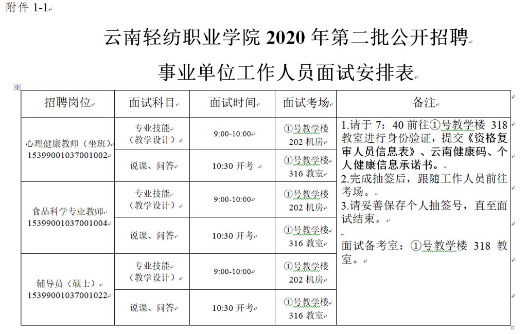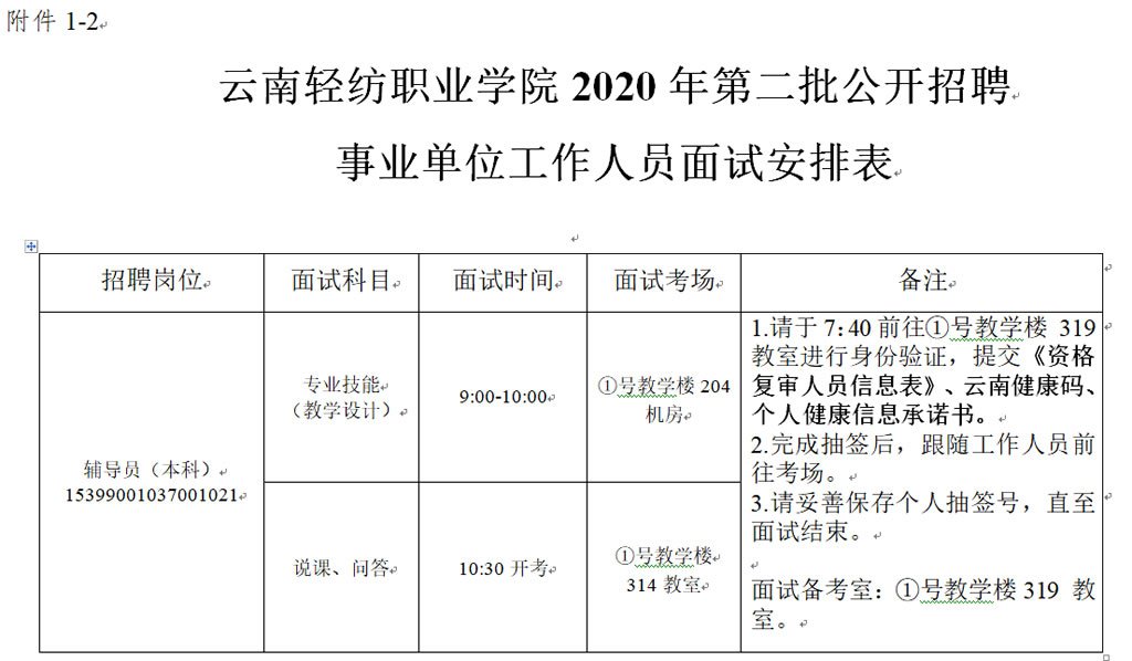1.云南輕紡職業(yè)學(xué)院2020年第二批公開招聘事業(yè)單位工作人員面試安排表