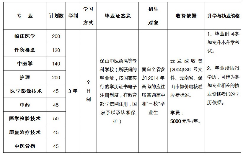 一、保山中醫(yī)藥高等專科學校2014年招生計劃: